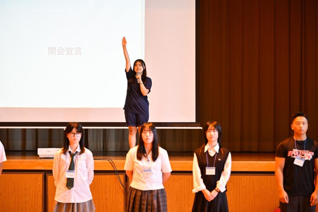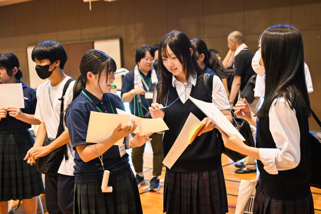1日目は午後から。バスや車で到着する他校の生徒たちを、小国高校の生徒たちが迎えていく。体育館の入り口で、一人一枚ずつ、高校名と名前を書いた紙を掲げて待つ。真夏の体育館は蒸し暑く、立っているだけで汗が吹き出す。それでも目が合えば、笑顔で迎え、談笑しながらそれぞれのテーブルへと向かっていく。すでに親しそうなのは、事前にオンラインで交流を重ねてきたから。