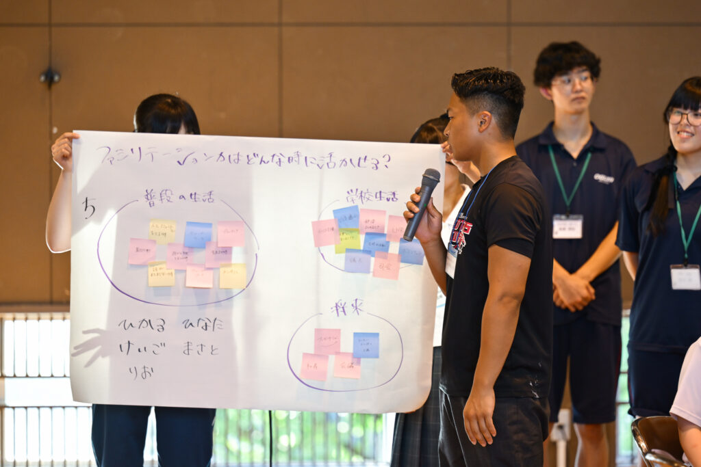 「ファシリテーションをよりよい話し合いの場にするためには、たくさんの意見が必要になってきます」——代表の一人が話した通り、グループごとに意見を交わし、「ちょっといいまくら」「家」などの突拍子もないアイデアに笑い合いながら、ファシリテーターがメンバーの意見を促して、大きな紙に議論の過程を記録していく。アイスブレイクも、ファシリテーションも、グラフィックレコーディングも、全て生徒たちが準備を重ねてきたものだ。
