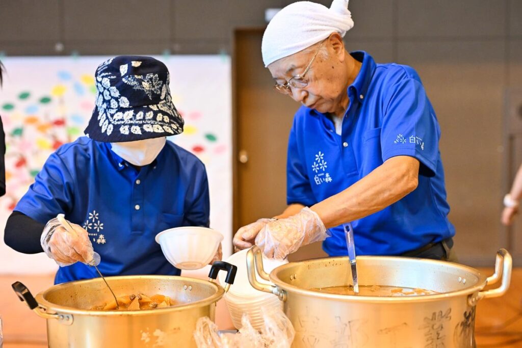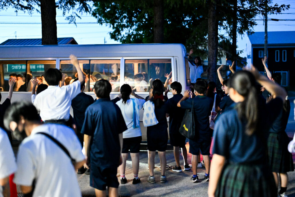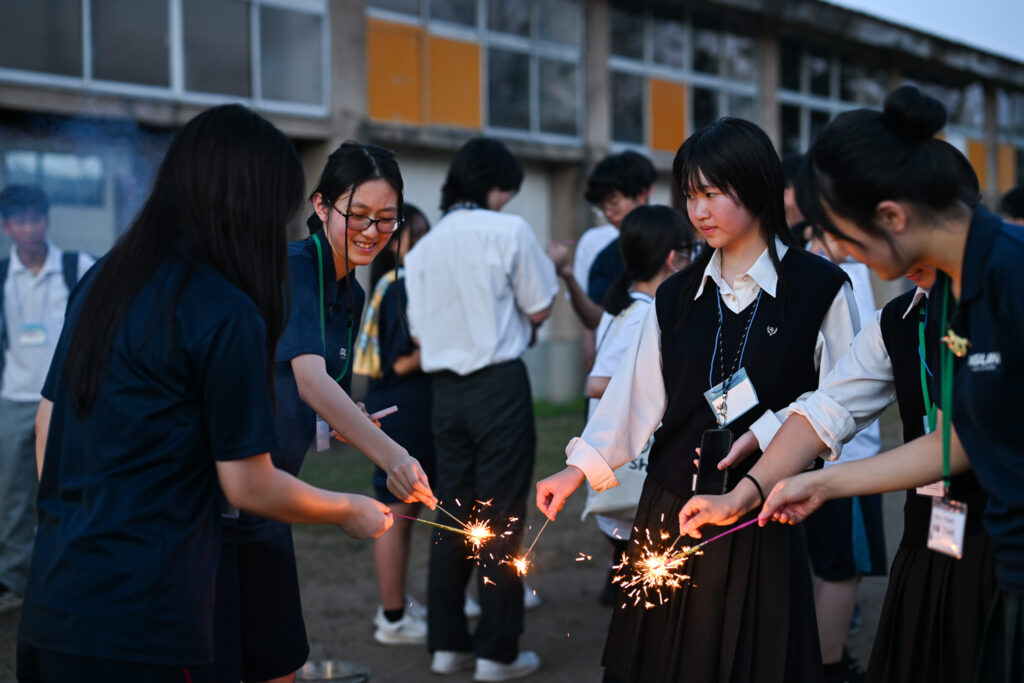 夕食はそのまま会場で。メインは熊汁。またぎ文化の根付く小国町らしいおもてなし。小国高校を支援する会会長特製の熊汁はサミットの名物になっているという。当然、熊汁を初めて口にする生徒が多く、「思ったよりおいしい!」と会話が弾む。夜は校庭で手持ち花火。誰かの火に、別の花火が重なって、また新しい会話が弾ける。制服の違い、学校間の壁も、いつの間にか小さくなったように見えた。